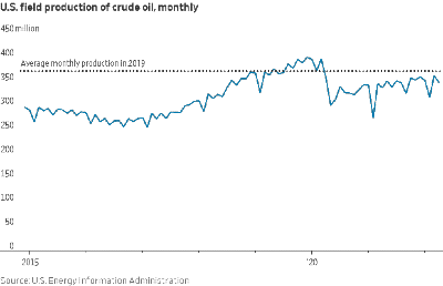 Nel corso del 2020 gli Stati Uniti sono diventati esportatori netti di petrolio per la prima volta. Le esportazioni di petrolio di produzione Americana sono stati 8.51 miliardi di barili nel 2020, mentre le importazioni sono state di 7.86 miliardi di barili, il livello più basso dal 1991. All'11 Giugno 2021 gli impianti di estrazione in America sono stati pari a 461 "rigs" [+182 rispetto al Giugno 2020]